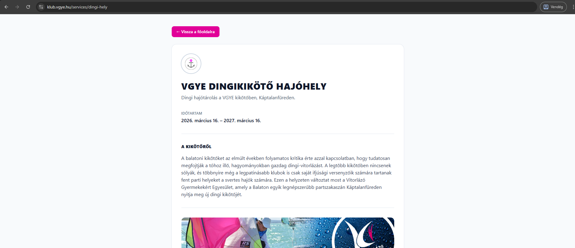 - A főoldalon kattints a „VGYE DINGIKIKÖTŐ HAJÓHELY” kártyára, vagy menj a /services/dingi-hely oldalra.