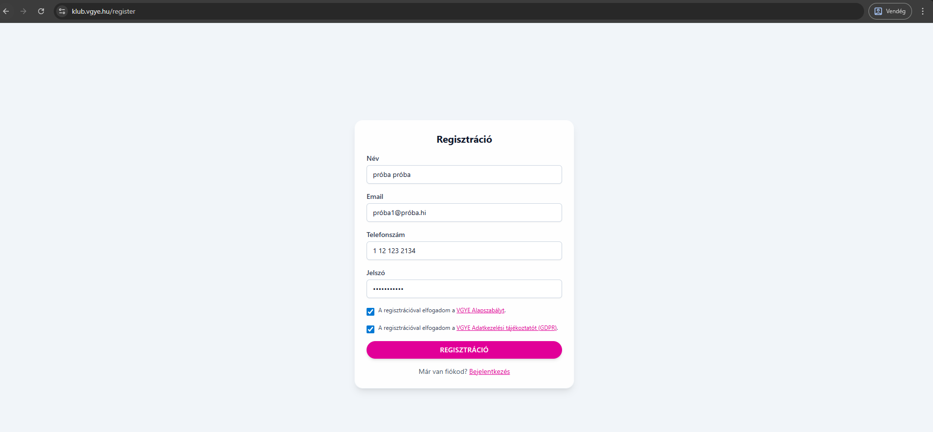 - Menj a klub.vgye.hu oldalra, és kattints a Bejelentkezés linkre (vagy nyisd meg közvetlenül a /login oldalt).