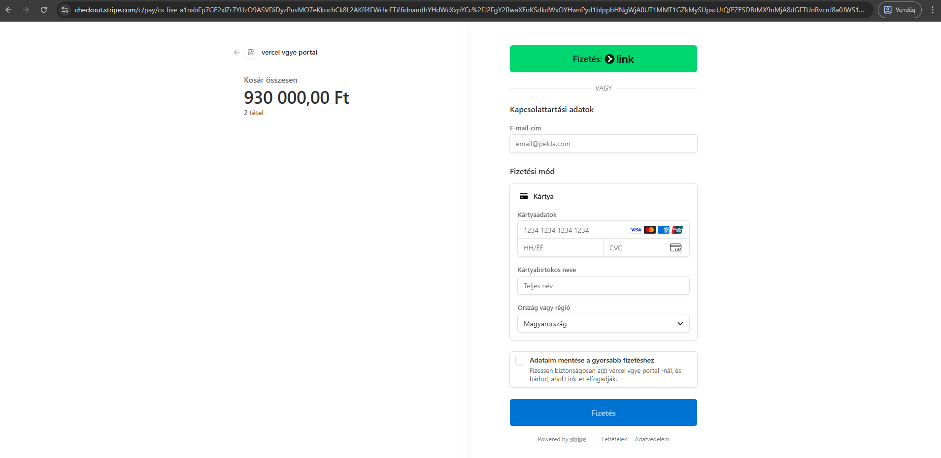 - A Fizetés gombra kattintva a Stripe fizetési felületre kerülsz.