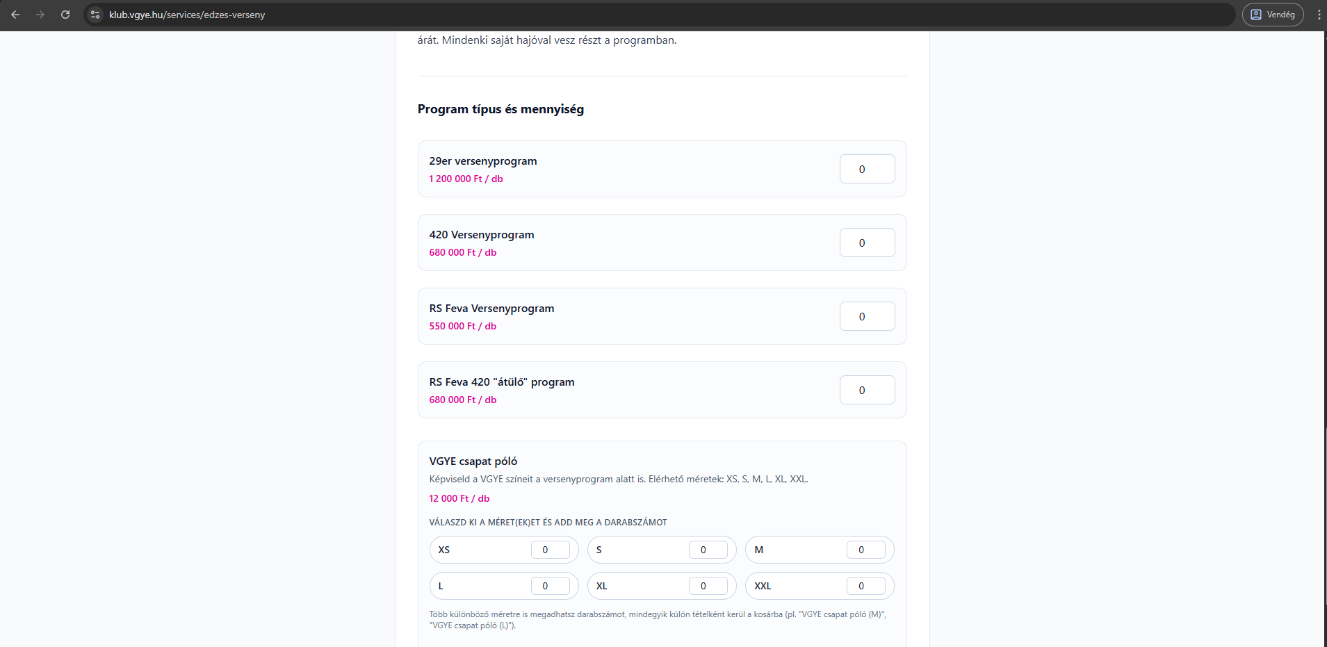 - Válaszd ki a megfelelő programot (pl. „Jelentkezés az 29er versenycsapatba” vagy „Jelentkezés az RS Feva versenycsapatba”), és kattints a Kosárba gombra.